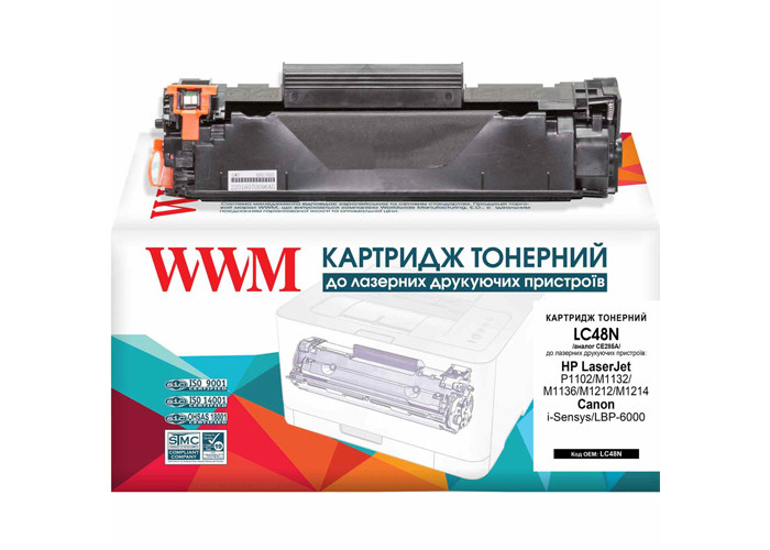 Картридж WWM LC48N - аналог картриджей Canon 725, HP CE285A. Предназначен для использования в принтерах Canon i-Sensys LBP-6000, LBP-6030, MF3010, Hewlett-Packard LaserJet P1102, M1132, M1212nf, M1217nfh, M1130.