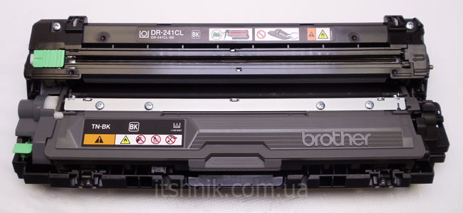 Устанавливаем тонер-картридж Brother TN в фотобарабан, очищаем нить коротрона зелёной кареткой, возвращаем блок фотобарабана с тонер-картриджем в принтер и печатаем.