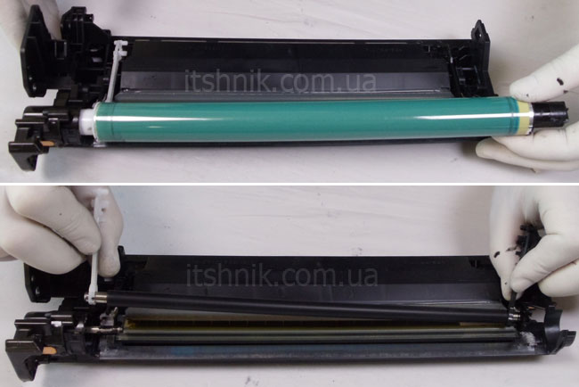 Извлекаем из посадочных мест фотобарабан и вал первичного заряда (PCR) вместе с направляющими белого и черного цвета: