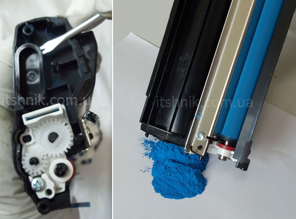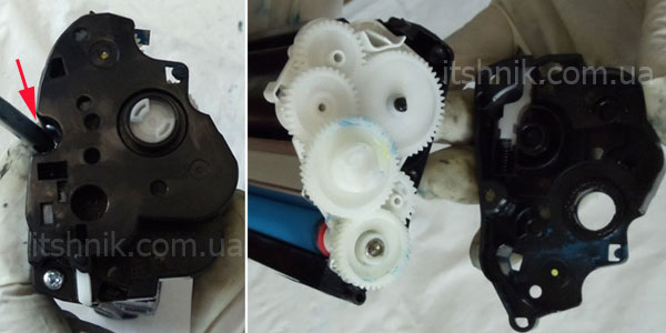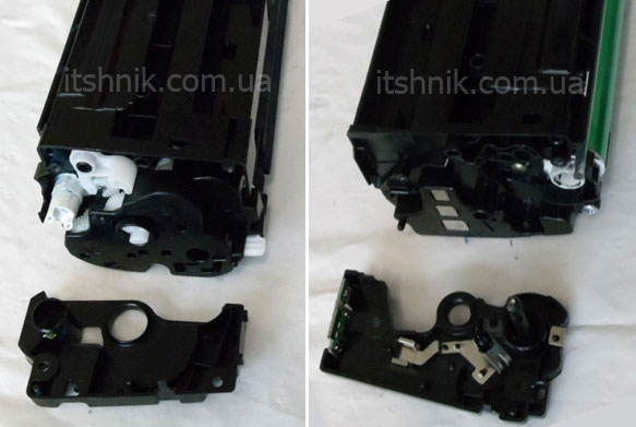 Висипавши залишки тонера, можемо продовжити разборку відсіку. Залишилося зняти останню частину бокової кришки з боку білих шестерень.