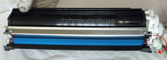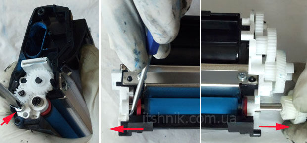 Далі потрібно зняти вал переносу тонера (Developer Roller). Відкручуємо фіксуючий шуруп, знімаємо шестерні, розташовані на кінцях осі вала.
