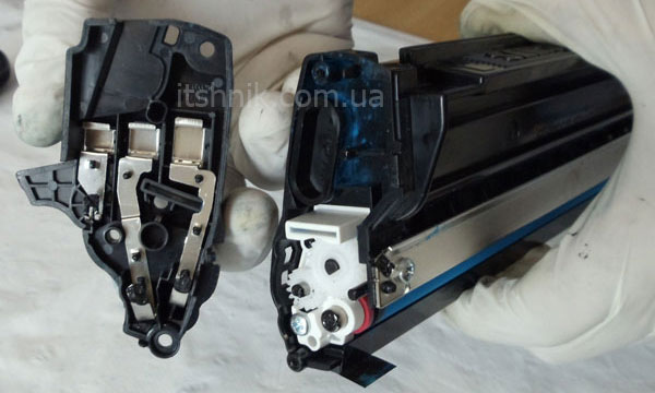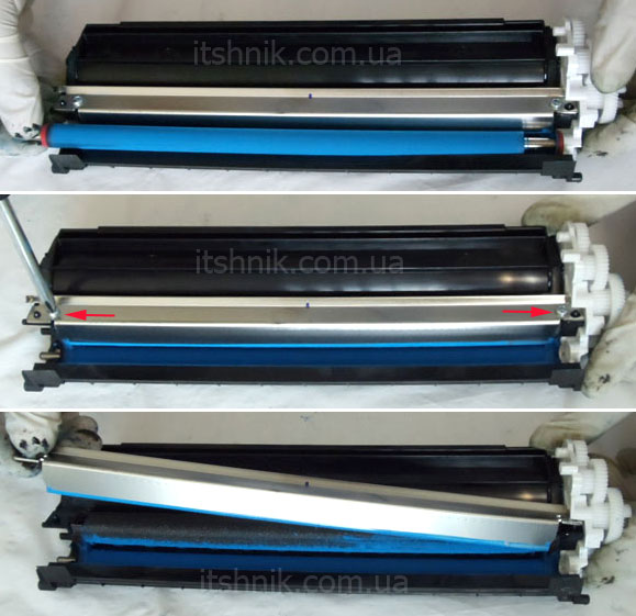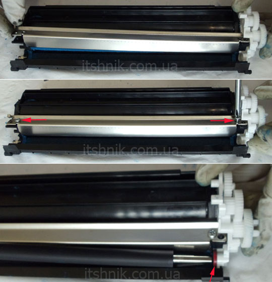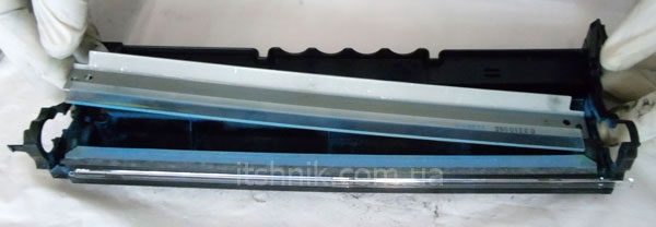 Витягуємо послідовно вал переносу тонера, дозуюче лезо, відкриваючи доступ до ніші тонерного відсіку картриджа.