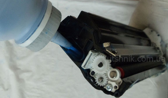 Засипавши порошок, щільно закриємо пробку тонерного відсіку. Тепер потрібно провернути вал переносу тонера, щоб переконатися в тому, що тонер розподіляється рівномірно по його поверхні.