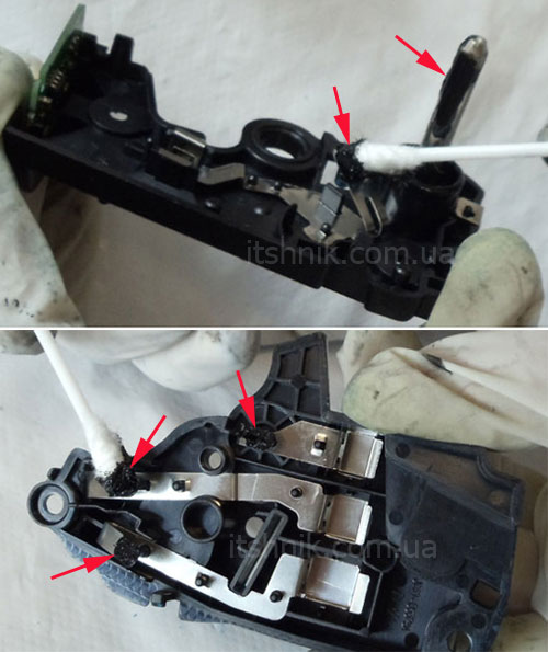 Перед тим, як одягнути бокові кришки, нанесемо невелику кількість струмопровідного мастила в місцях контакту з осями валу PCR, фетрового ролика і валу переносу тонера.