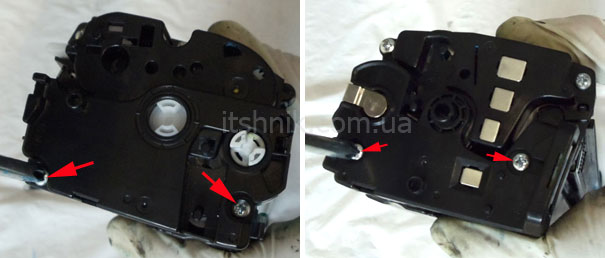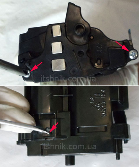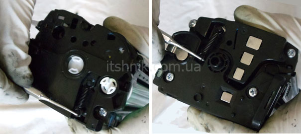 Прийшов час зняти другі половинки бокових кришок картриджа. Для цього розкручуємо шурупи і звільняємо «замок» з боку, протилежного білим шестірням: