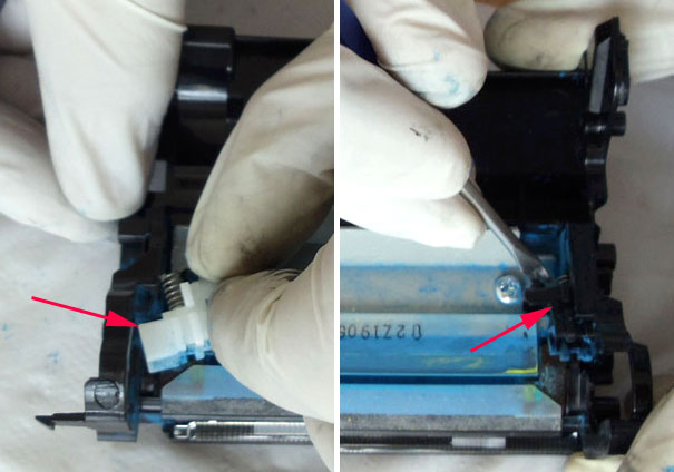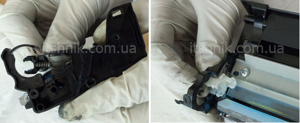 Далі, для того, щоб зняти лезо очищення (ракель), потрібно вийняти з посадочних місць бокові тримачі ("сідла") вала PCR. З одного боку розташоване "сідло" білого кольору, з іншого боку - чорного: