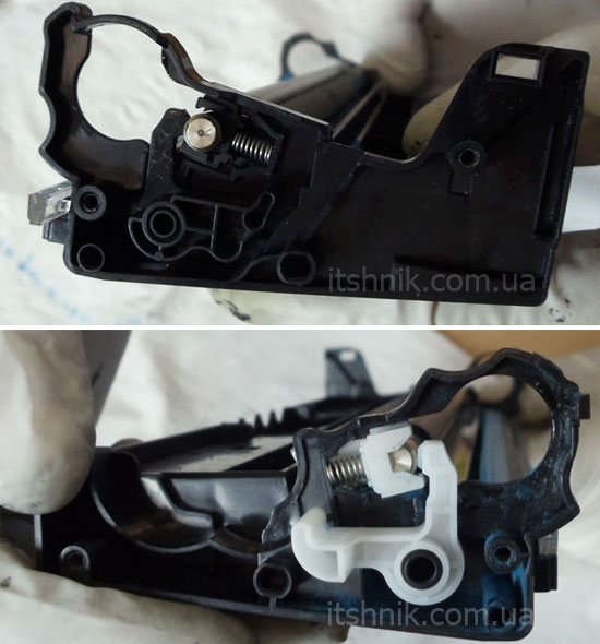 Разборка картриджа починається зі зняття бокових кришок. Для цього спочатку знімаємо пружини-тримачі з обох бокових кришок: