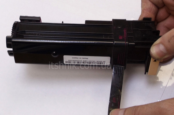 Перш за все, потрібно зняти клейку стрічку чорного кольору, що охоплює шов між тонерним відсіком та відходним бункером.