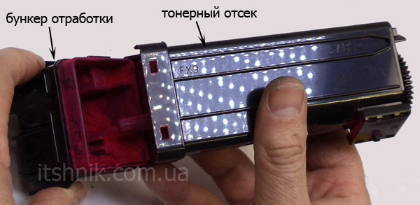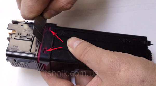 Тепер потрібно відокремити відходний бункер від тонерного відсіку. Для цього трохи натиснемо на два замки в отворах, зазначених стрілками на фото нижче і акуратно роз'єднаємо тубу на дві частини:
