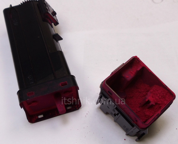 Далі знімаємо пробку тонерного відсіку. У відсіку може залишатися невелика кількість невикористаного чистого тонера. Цей тонер теж витрушуємо або вичищаємо вакуумним пилососом.