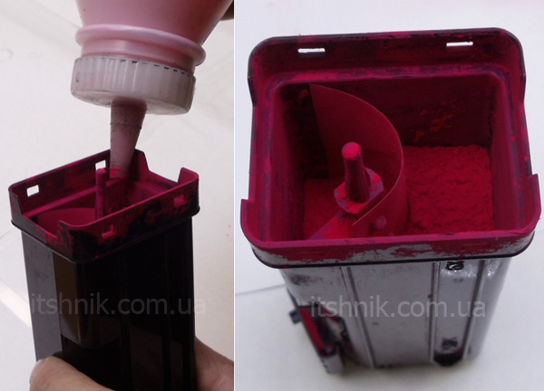В чистий відсік можна засипати банку нового тонера D1320-30B-MA. Одна банка тонера розрахована на одну заправку картриджа.