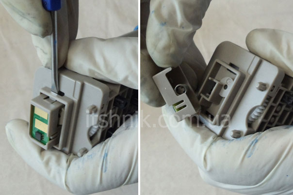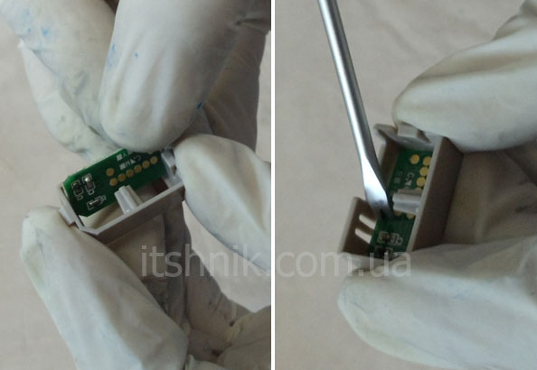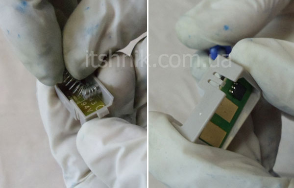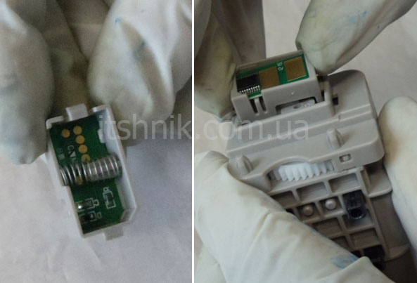 Встановимо новий чіп замість відпрацьованого. Чіп повинен щільно зафіксуватися на дні кошика, потрапивши під свій замок.