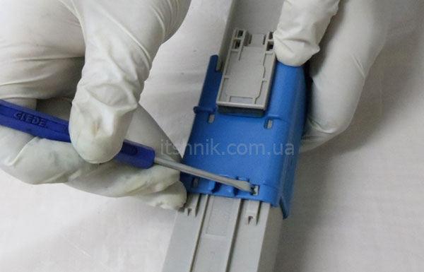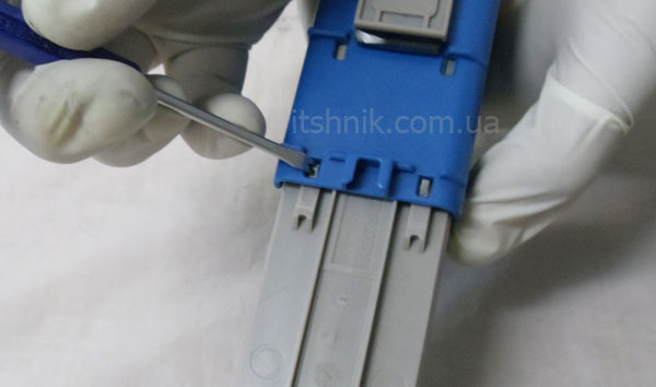 Отже, приступимо до роботи. Для початку потрібно звільнити два замки на нижньому боці туби під синьою засл. Для цього трохи здавлюємо замок зліва: