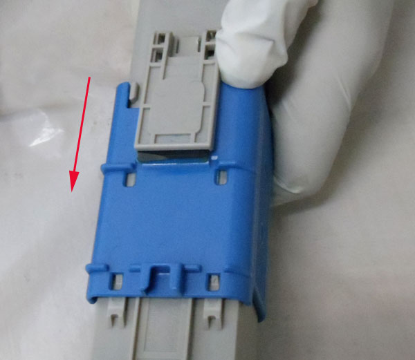 Потім потрібно зрушити синю засувку у напрямку до замків на 3-4 мм. Таким чином, засувка притисне замки, щоб вони не перешкоджали відкриттю туби.