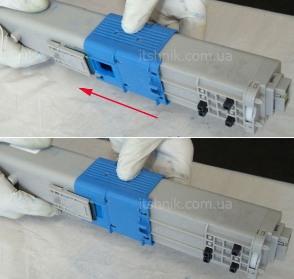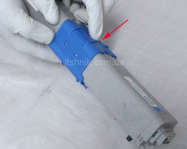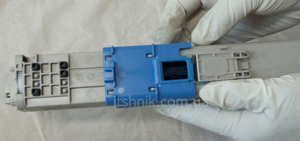 Так внутрішній замок розкриється (випаде всередину туби) і ми зможемо відкрити синю засувку повністю. Усередині картриджа може залишатися певна кількість тонера, який слід вичистити вакуумним пилососом або витрусити в герметичний пакет.