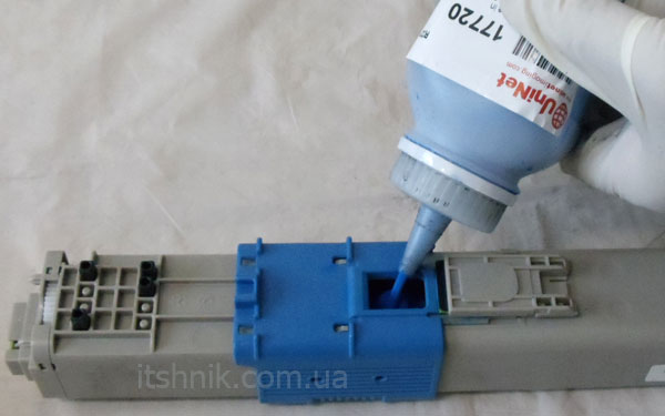 Ми покажемо заправку на прикладі синього картриджа OKI 44469706 Cyan. Решта три картриджі заправляються аналогічно синьому.