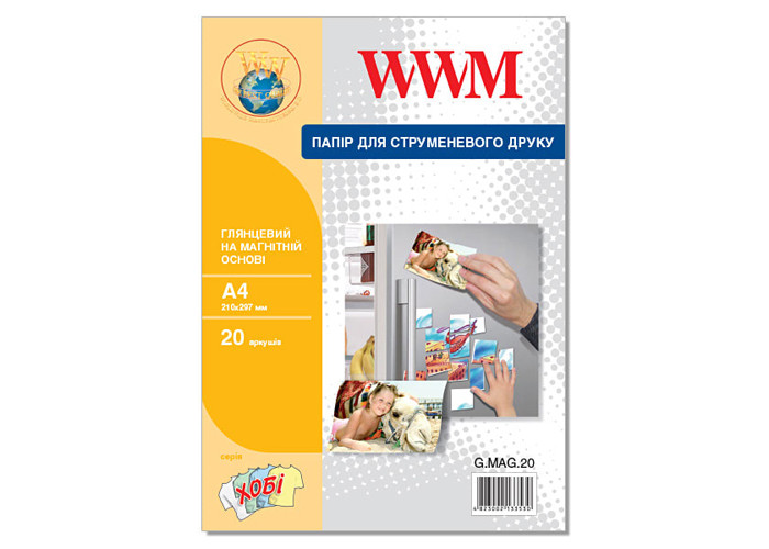 Фотобумага глянцевая магнитная WWM (G.MAG.20) формат A4, плотность примерно 650г/м2, 20 листов толщиной 0,35мм. Односторонняя бумага с магнитной подложкой для струйной печати водорастворимыми чернилами.