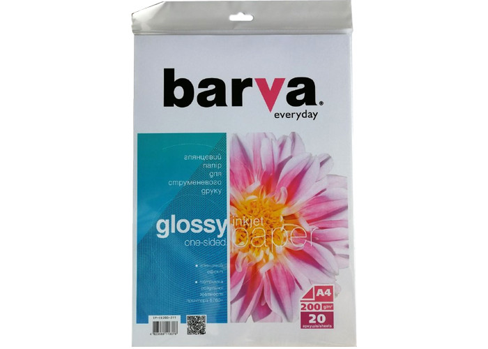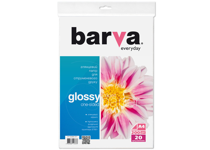Односторонняя глянцевая фотобумага Everyday Barva (IP-CE200-211) формат A4, плотность 200г/м2, 20 листов в пачке. Бумага предназначена для струйных принтеров на водорастворимых чернилах.