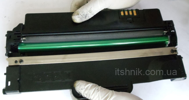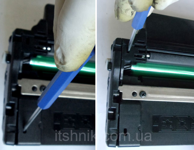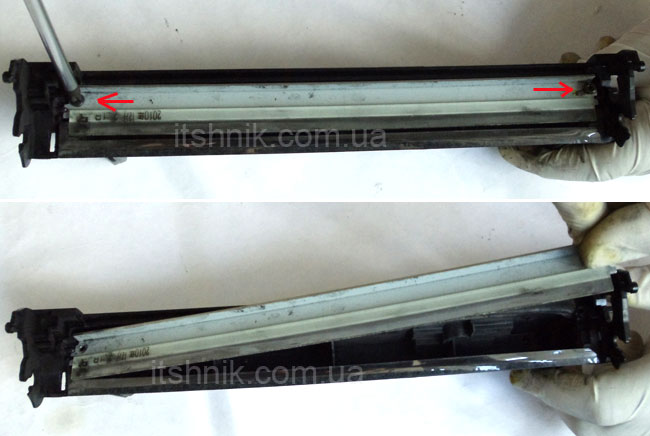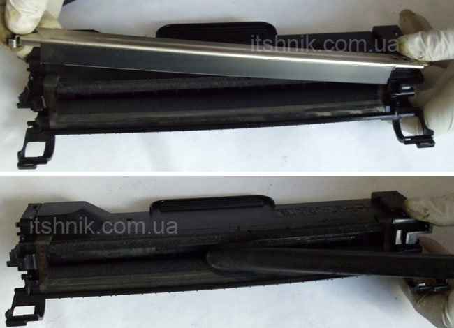 Відкрутимо шурупи, що утримують ракель (лезо очищення) з обох боків. Лезо потрібно очистити від забруднень. Якщо края силіконового боку ракеля пошкоджені або деформовані, то слід замінити лезо на нове. Звільнивши бункер від леза, очищаємо його вміст від залишків тонера.
