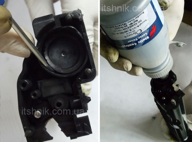 Відкривши пробку бункера, звільняємо його вміст від залишків тонера і ретельно очищуємо.