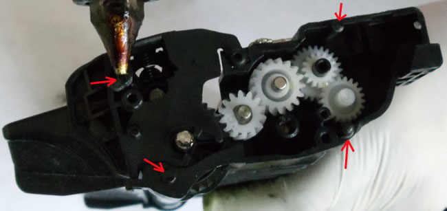 Нанесемо по краплині гарячого пластику на опорні вершини. Намагайтеся використовувати небагато клею, щоб при наступних розборках картриджа не виникало складнощів при розкритті.