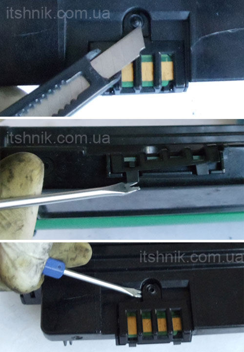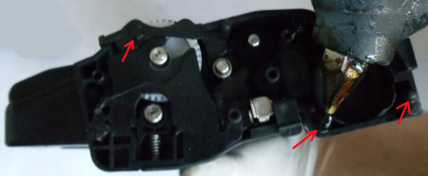 Для того щоб розібрати картридж, зріжемо ножем пластик в точках кріплення корпусу з лівого та правого боків, як зазначено на фото:
