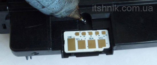 Встановимо новий чіп в посадочне місце. Для того, щоб закріпити решітку, знову скористаємося краплею гарячого пластику.
