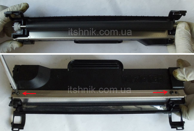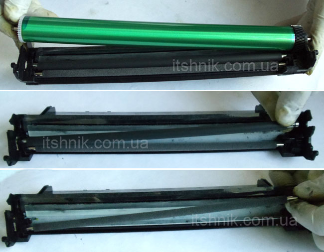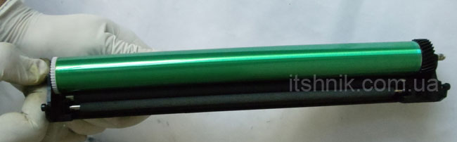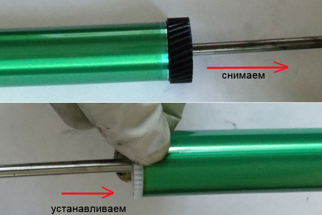 Якщо виникла необхідність замінити фотобарабан (наприклад, при відновленні картриджа), то металеву вісь слід виймати у напрямку від малої шестерні до великої - і назовні. А встановлювати вісь назад потрібно з боку малої шестерні барабана. Це важливо, тому що всередині фотоциліндра розташовані струмопровідні контакти, які можна пошкодити, якщо встановлювати вісь в невірному напрямку. Струмопровідне мастило слід наносити не по всій площі осі, а лише з того кінця, який буде взаємодіяти з контактною групою всередині фотобарабана. Нагадуємо про те, що кількістю струмопровідного мастила не слід зловживати.