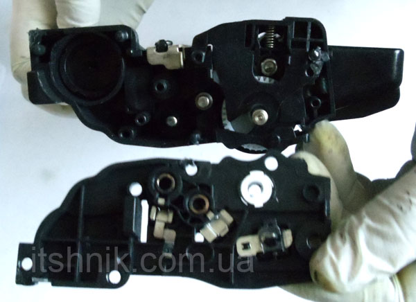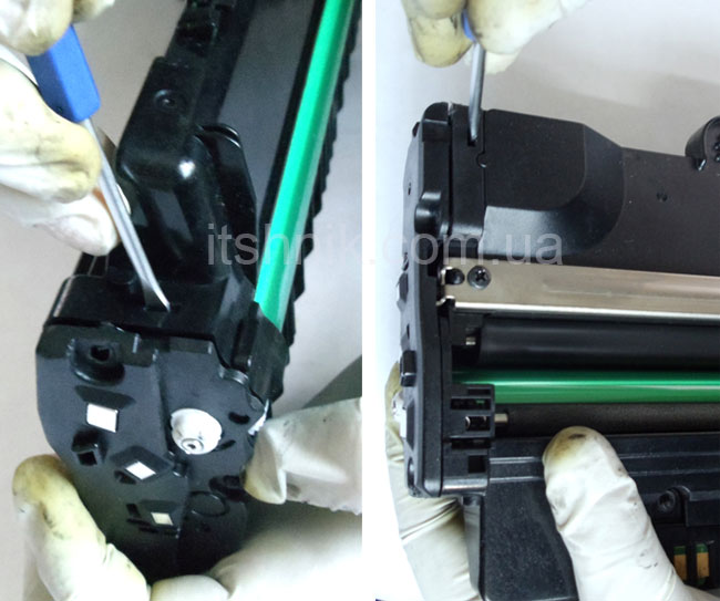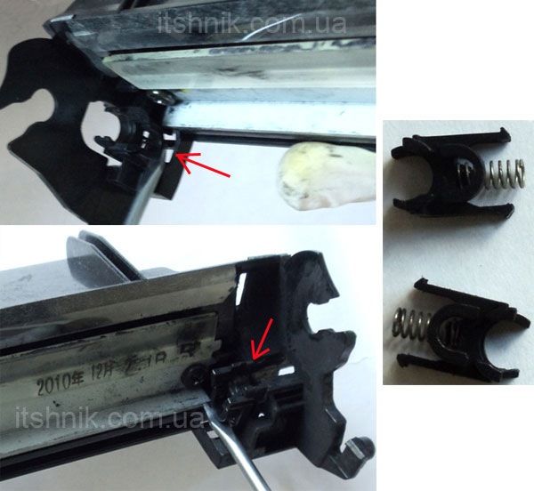 Повернемося до розборки відсіку. За допомогою інструменту з плоским наконечником виймаємо з посадочних місць тримачі вала первинного заряду. Тримачі потрібно зняти, щоб звільнити доступ до чистячого леза картриджа (ракеля).