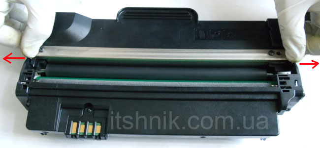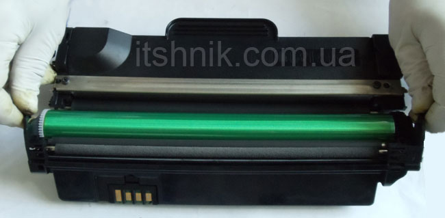 Дуже акуратно роз'єднайте дві половинки картриджа, щоб не пошкодити поверхню фотоциліндра: