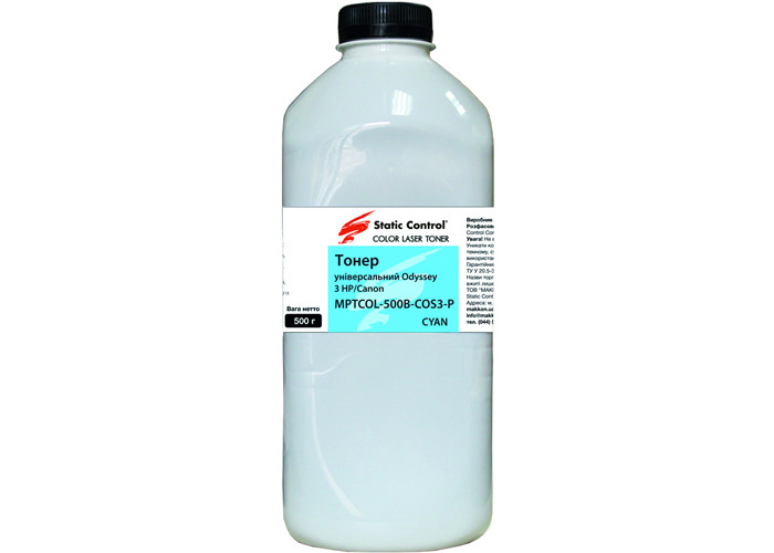 Универсальный синий тонер Static Control MPTCOL-500B-COS3-P Cyan серии Odyssey3 для принтеров Canon, Hewlett-Packard. Вес 500 грамм.