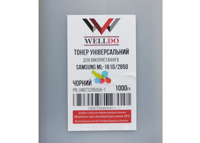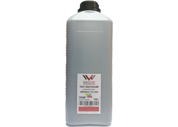 Универсальный тонер Welldo (UWDTS2850UH-1) 1кг для принтеров Samsung ML-1610, ML-1630, ML-1640, ML-1641, ML-1660, ML-1665, ML-1666, ML-1676, ML-1510, ML-1710, ML-1740, ML-1 750, ML-1910, ML-1915, ML-1210, ML-1220, ML-1250, ML-1430, ML-2010, ML-2015, ML-2150, ML-2240, ML-2241, ML-2245, ML-2250, ML-2450, ML-2510, ML-2525, ML-2526, ML-2550, ML-2570, ML-2571, ML-2580, ML-2850, ML-2851, ML-2 950, ML-2951, ML-2955, ML-2956, ML-3050, ML-3051, ML-3310, ML-3312, ML-3300, ML-3470, ML-3560, ML-3710, ML-3750, ML-4550, Xpress SL-M2620, M2625, M2626, M2676, M2875, M2876, M3320, M3370, M3820, M3870, M4020, M4070, M3325, M3375, M3825, M3875, M4025, M4075, SCX-3200, SCX-3201, SCX-3205, SCX-3206, SCX-3218, SCX-4016, SCX-4100, SCX-4116, SCX-4216, SCX-4300, SCX-4321, SCX-4521, SCX-4600, SCX-4623, SCX-4727, SCX-4728, SCX-4729, SCX-4833, SCX-5530, SCX-5637, SCX-5639, SCX-6330, Xerox Work Centre 3312, WC3315, WC3325, Pe16, Pe114, Phaser 3120 / 3140 / 3155 / 3160, WC3210, WC3220, Phaser 3100, Hewlett-PackardNeverstop Laser M107a, M135, M137, Panasonic KX-MB1500, KX-MB1520, KX-MB1530.