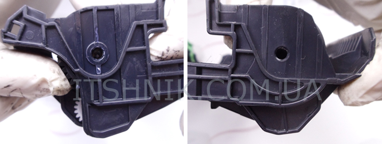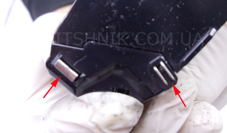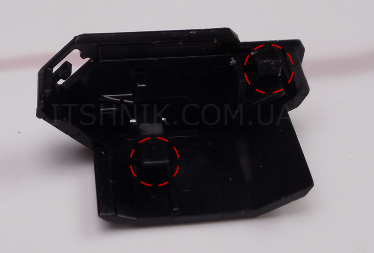 І знімаємо бокову пластикову заглушку, в якої теж є кліпси-фіксатори. Одну кліпсу (вказана на фото нижче) вдавлюємо, звільняючи заглушку з одного боку. Плоским шліцом викрутки допомагаємо заглушці відокремитися від корпусу. Друга кліпса утримує заглушку зсередини.
