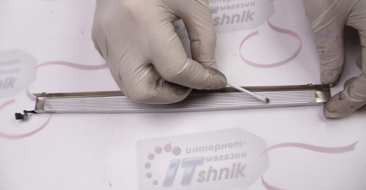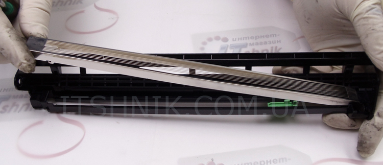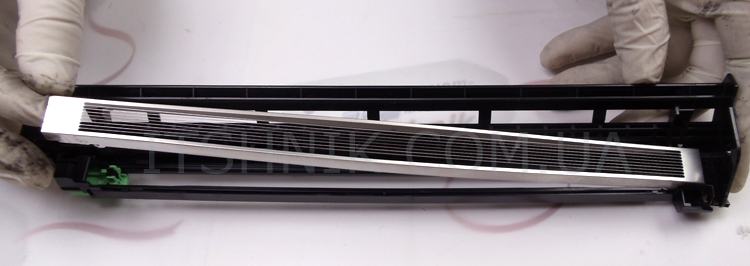 Нагадуємо, що з сіткою коронатора і ниткою коротрона потрібно поводитися дуже дбайливо. Нитка коротрона залишається в корпусі, а сітку коронатора можна очистити ізопропілом зсередини по всій довжині. Ретельно чистимо сітку, до тих пір, поки ватяна паличка не буде залишатися чистою.