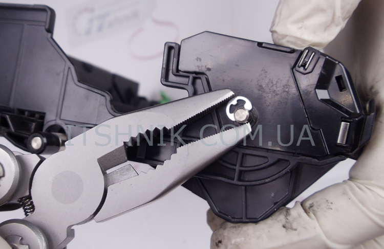 Розборка блоку барабана починається з вилучення осі фотоциліндра. Ось фотоциліндра фіксується Е-образними шайбами з обох кінців. Звільняємо шайбу з боку, протилежного шестірні барабана. Кільце стопорне (Е-шайба) дуже дрібне, його легко загубити як при вилученні, так і при установці. Якщо його втратите - не турбуйтеся, в нашому інтернет-магазині можна купити нове)