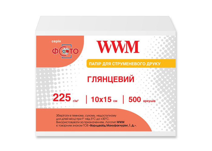 WWM (G225.F500) Фотобумага глянцевая 10х15см, пачка 500 листов, плотность 225г/м2. Для струйной печати водорастворимыми чернилами.