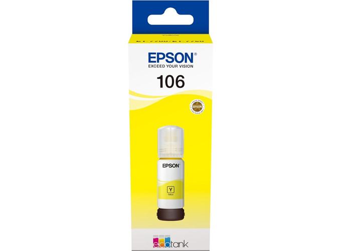 Оригинальные чернила Epson 106 Yellow ecotank контейнер с желтыми чернилами на водной основе. Для заправки принтеров "фабрика печати" Epson L7160, L7180.
