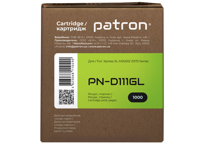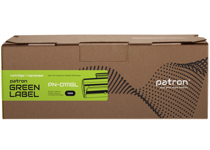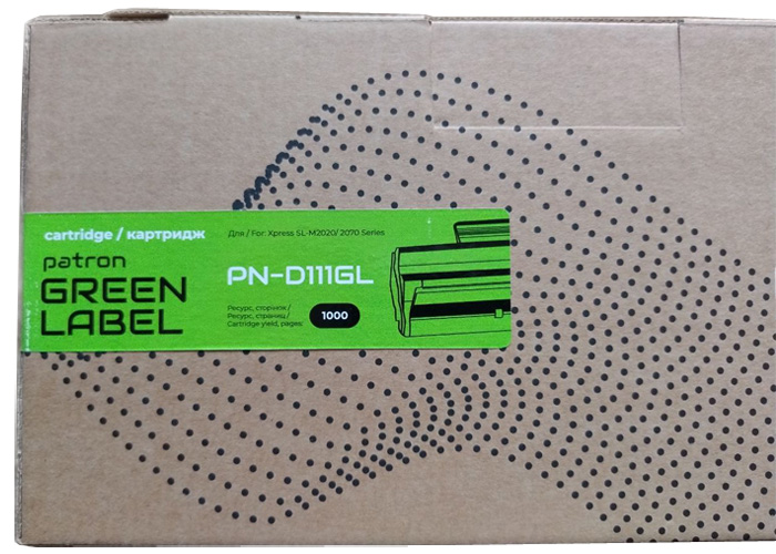 Картридж Patron (PN-D111GL) SAM-MLT-D111SPNGL Green Label аналог тонер-картриджа Samsung MLT-D111S стандартной емкости. Совместимость с принтерами и МФУ: SL-M2020, SL-M2020W, SL-M2070W, SL-M2070, SL-M2070FW.