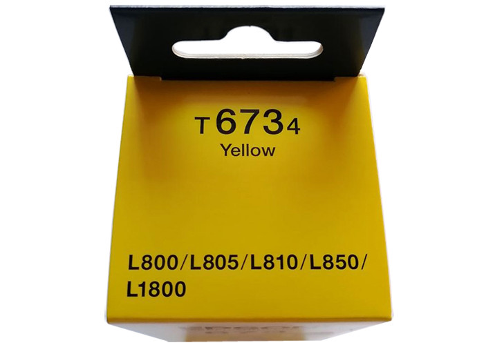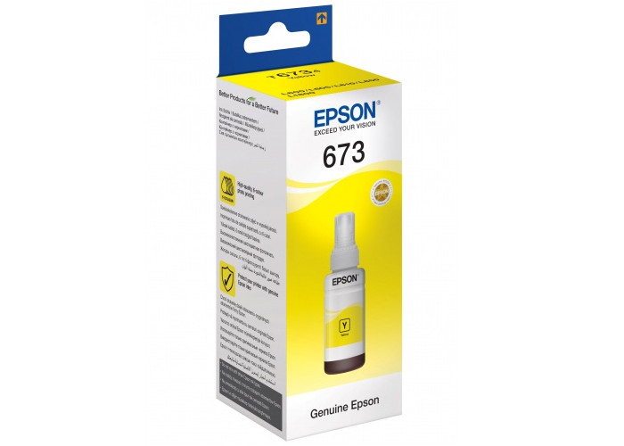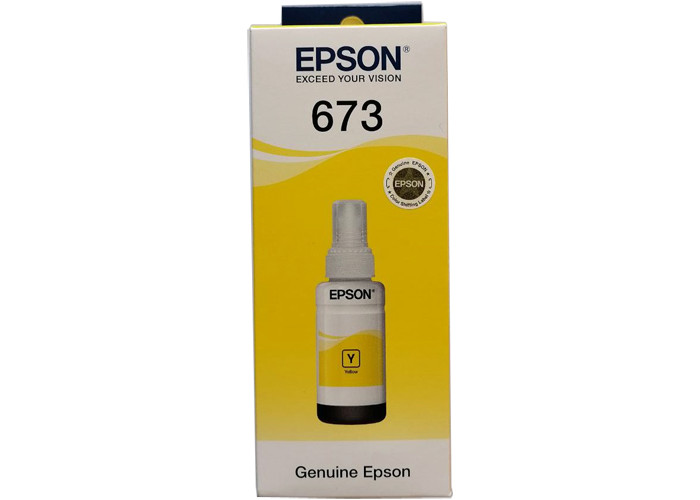 Оригинальные желтые чернила Epson (C13T67344A) Yellow, предназначенные для заправки принтера "Фабрика печати" L800, L805, L810, L850, L1800. Контейнер с желтыми чернилами.