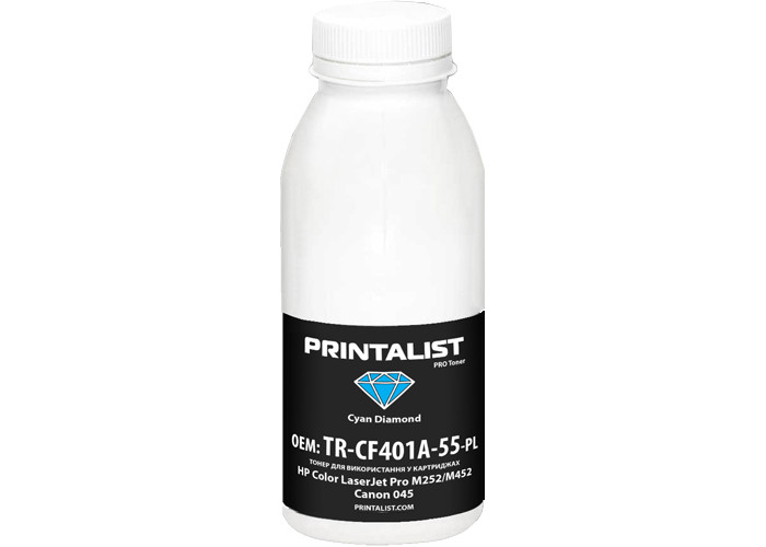 Синий тонер Printalist (TR-CF401A-55-PL) 50г Cyan для заправки принтеров Canon i-SENSYS LBP621Cw, LBP623Cdw, LBP663Cdw, LBP664Cx, LBP653Cdw, MF631Cn, MF633Cdw, MF635Cx, MF641Cw, MF643Cdw, MF645, MF655, MF732Cdw, MF734Cdw, MF735Cx, MF742Cdw, MF744, MF746Cx, LBP611Cn, LBP613Cdw, LBP654Cx, LBP673, MF752, MF754, Hewlett-Packard Color LaserJet CP4025, CP4525, M480, M252, M254, M274n, M277dw, M280, M281, M377, M452, M477, M479, Enterprise M455, M255, M282, M283, M155, M182, M183, M454.