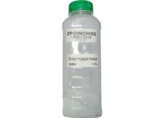 Старт-пудра цинковая (тальк, присыпка) для фотобарабанов, лезвий очистки (ZPOWCH50). Фасовка - флакон, вес 50 грамм.
