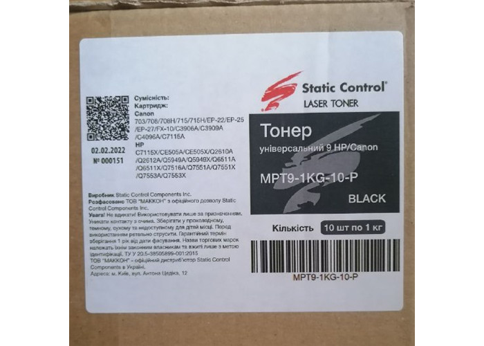 Универсальный тонер для сервисных центров Static Control MPT9-1KG-10-P (10шт по 1кг). Для заправки принтеров Hewlett-Packard LaserJet 1000, 1010, 1012, 1015, 1018, 1020, 1022, 1150, 1160, 1200, 1220, 1300, 1320, M1005, M1319f, P2014, P2015, P2035, P2055; Canon i-SENSYS LBP-2900, LBP-3000, LBP-3300, LBP-3310, LBP-3330, LBP-3360, LBP-3370, LBP-6680, LBP-6670, LBP-6650, LBP-6310, LBP-6300, MF4120, MF4140, MF4150, MF4320d, MF4330d, MF4340d, MF4350d, MF4370dn, MF4380dn, MF4018, MF4270, MF4660PL, MF4690PL.